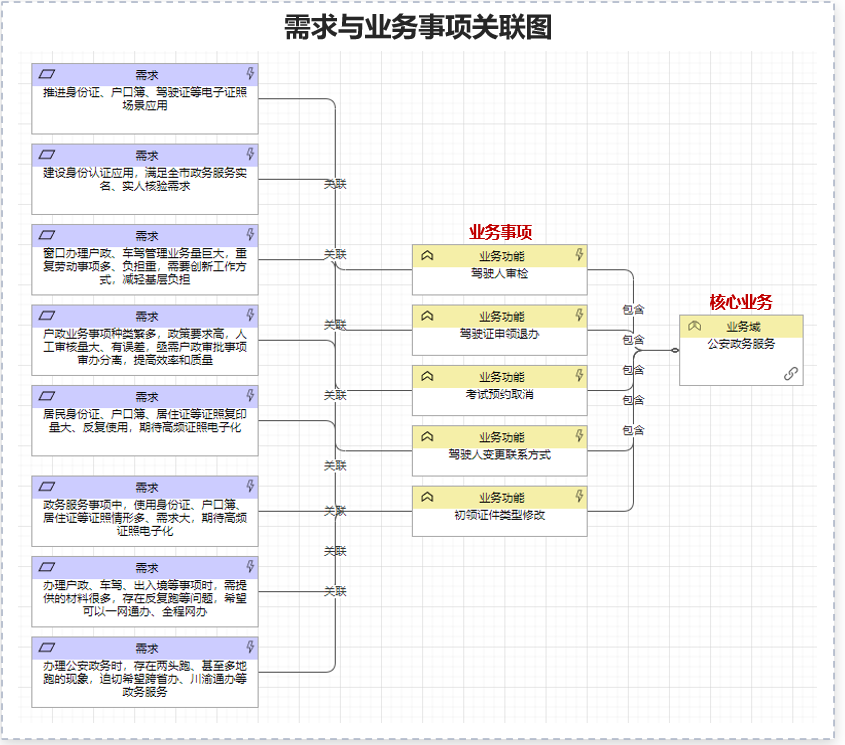 需求與業(yè)務(wù)事項(xiàng)關(guān)聯(lián):通過工具將重大需求關(guān)聯(lián)到核心業(yè)務(wù)及業(yè)務(wù)事項(xiàng)。定準(zhǔn)核心業(yè)務(wù)是“V”模型應(yīng)用的起點(diǎn),從需求出發(fā),謀劃多跨場景的第一步就是要找到場景所在的核心業(yè)務(wù)和事項(xiàng),自此開始對業(yè)務(wù)進(jìn)行多跨場景的拆解和集成。
