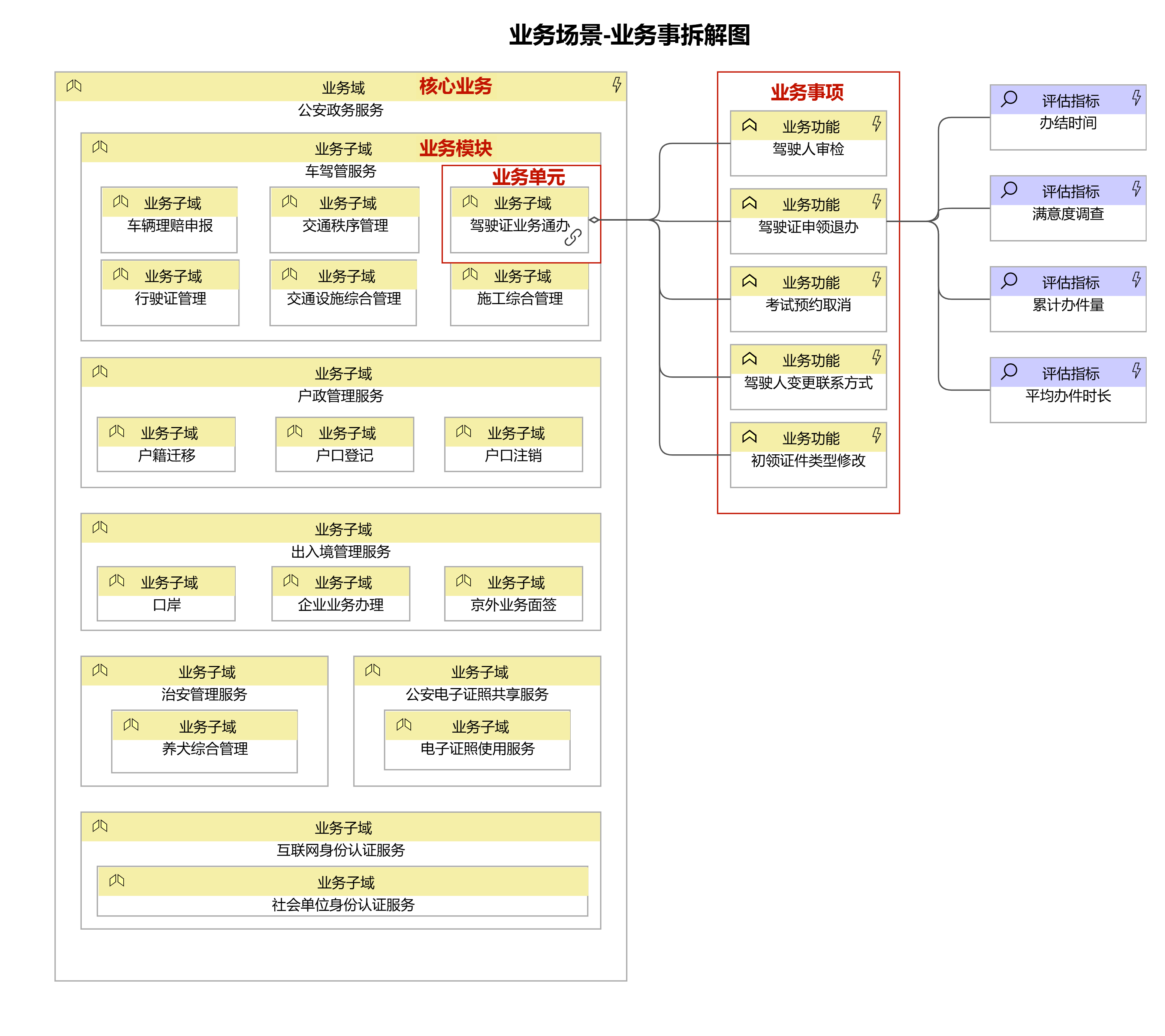 業(yè)務(wù)場景與事項(xiàng)拆解:從“大場景”中尋找“小切口”,對核心業(yè)務(wù)逐層拆解出業(yè)務(wù)場景、業(yè)務(wù)單元,直至最小級別的業(yè)務(wù)事項(xiàng)。最小級別的業(yè)務(wù)事項(xiàng)可以理解為單個部門履職具體化的最小單元,它關(guān)聯(lián)了主責(zé)部門、使用的數(shù)據(jù)等要素。對多個業(yè)務(wù)事項(xiàng)編排,形成解決特定業(yè)務(wù)需求的流程。因此,謀劃多跨協(xié)同場景需要將業(yè)務(wù)拆解到最小級別的業(yè)務(wù)事項(xiàng)才能滿足要求。