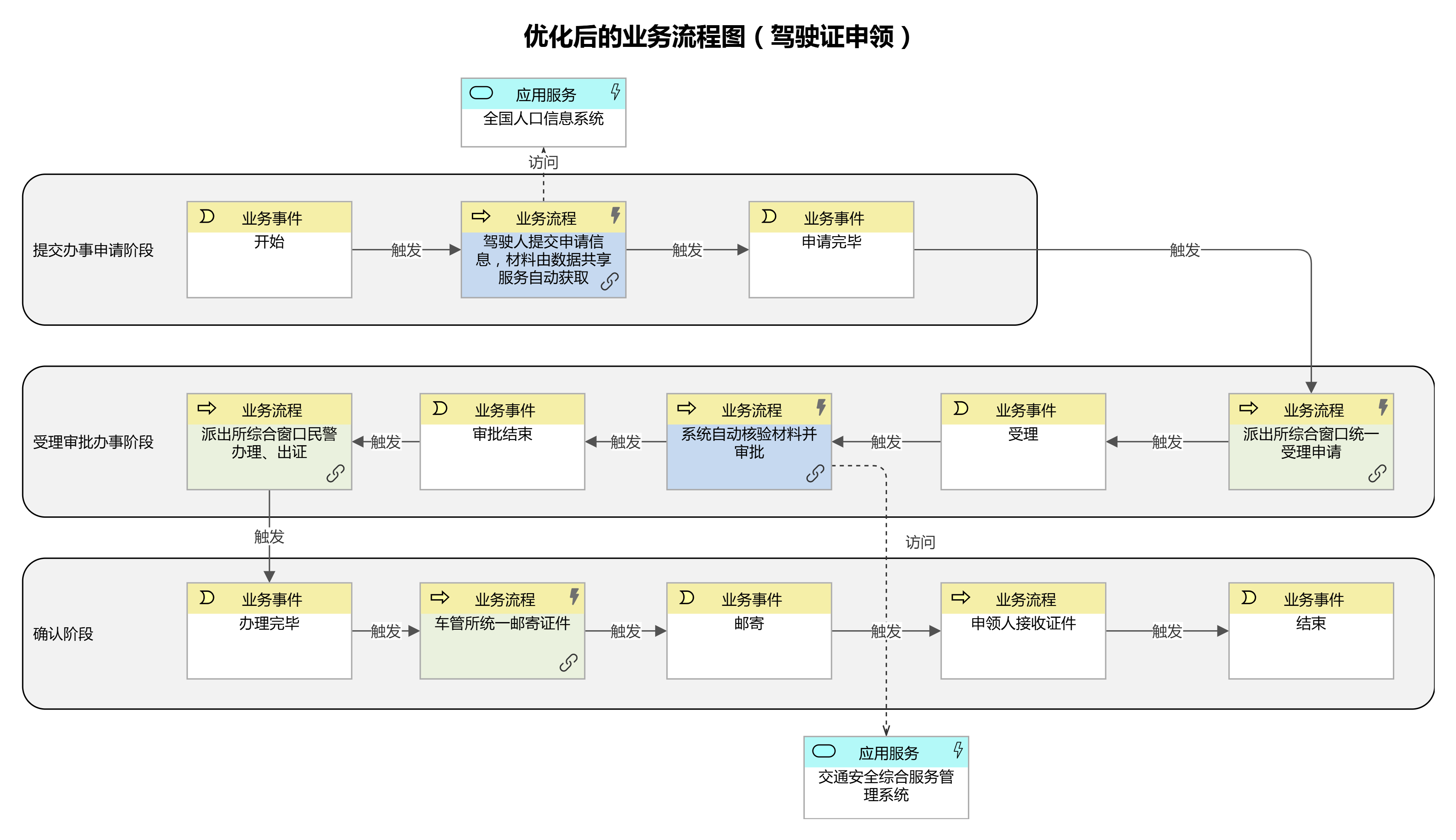 優(yōu)化業(yè)務(wù)流程:謀劃好可集成的數(shù)據(jù)、可協(xié)同的部門后即完成了多跨場景的集成過程。集成后形成的新流程活動替換現(xiàn)行活動,實(shí)現(xiàn)流程的再造。再造流程將解決重大需求中描述的“堵點(diǎn)”、“卡點(diǎn)”問題,因此新流程中的創(chuàng)新活動、智能活動就是需要改革的項(xiàng)目。