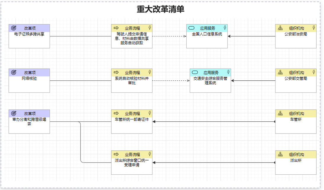 將再造流程中的創(chuàng)新點(diǎn)關(guān)聯(lián)到涉及的應(yīng)用系統(tǒng)以及主管部門,即可形成完整的改革項(xiàng),最終作為梳理重大改革清單的素材。