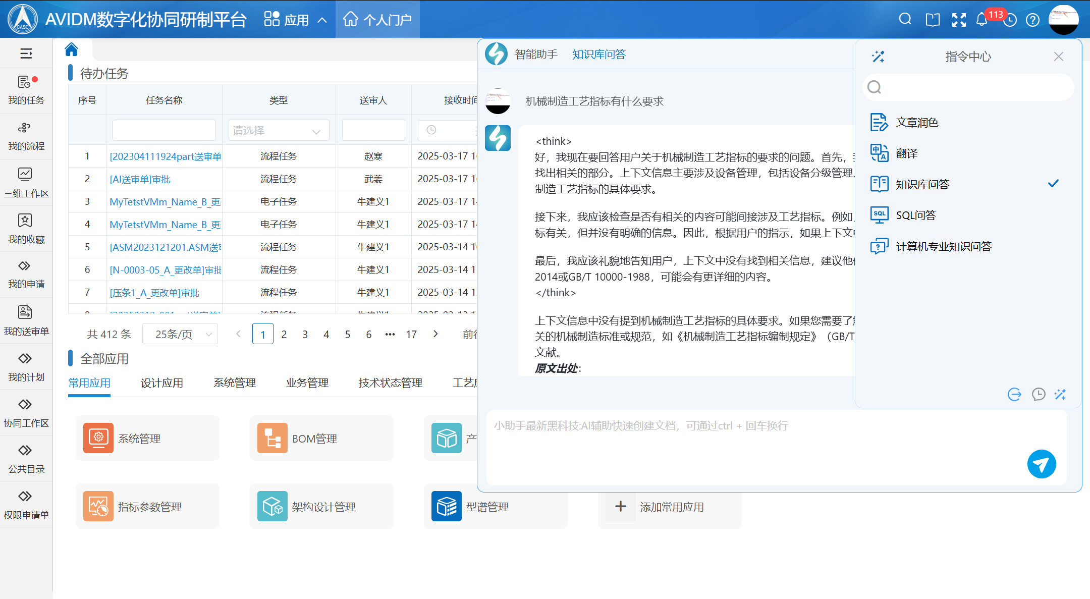 AVPLM系統(tǒng)已具備科研生產(chǎn)智能問(wèn)答、文檔智能生成、文檔智能審查、工藝智能生成等智能化場(chǎng)景應(yīng)用能力。